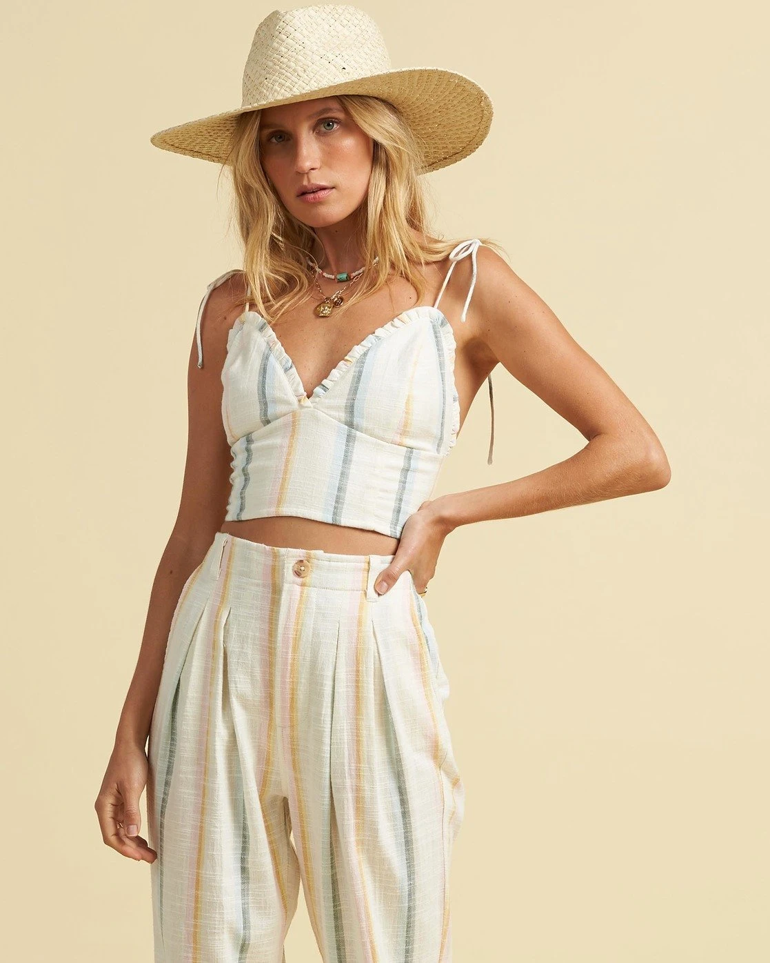 Style: J5253bnoa play on a triangle bikini top, the Billabong Northern Lights Crop Top doesn’t stray too far from its sun-bleached sister. Preserving your bikini top tan lines long after you’ve left the beach, the woven cami features tie-top spaghetti straps, triangle cups edged with feminine ruffles and a smocked back panel. Eco certified by the Better Cotton Initiative, the cotton construction ensures you’re doing good while looking good. Features: : Billabong x Salty Blonde Collection. Womens’ triangle crop top. Smocked back panel. Adjustable spaghetti straps. Pattern: yarn dyed stripes. Material: Eco- Conscious Cotton. Materials100% Cotton Model Details: Paige is wearing a size Small. Height: 5’9′ Chest: 32′ Waist: 23′ Hips: 34′ / Womens Tank Top Salty Blonde Northern Lights in Multi / M/10 / 100% Cotton / Billabong